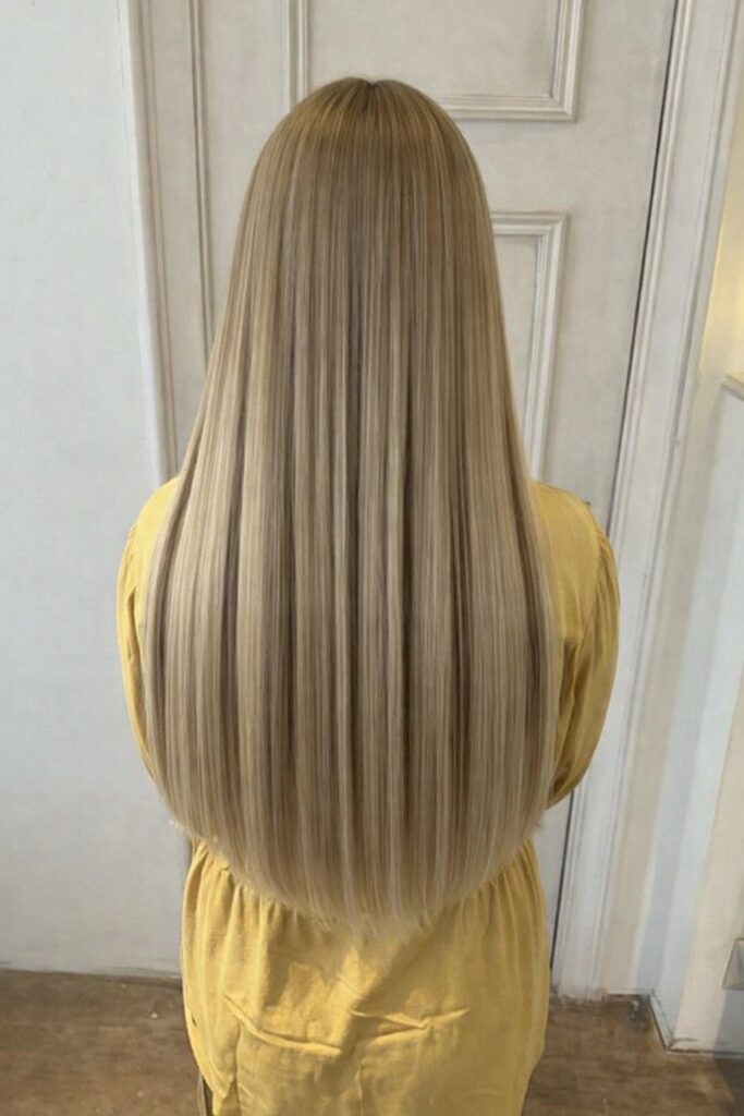 今回は地毛の色に近いシルバーのシールエクステで長さを出し、表面とインナーにブラウンのローライトをつけています。
